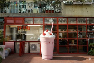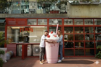 “À direita do copo, (alguém muito parecido) com a Taylor Swift. À esquerda do copo, (um sósia) do Neymar. Os dois estão abraçados com o copo, como se estivessem maravilhados com o tamanho do milkshake. Eles são proporcionais ao tamanho dos outros elementos do cenário, com suas cabeças na altura máxima do topo da cobertura do milkshake. Aplique neles uma iluminação difusa que seja consistente com a luz ambiente da rua e do estabelecimento vermelho.”