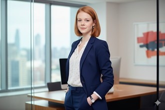 “Faça um retrato de uma mulher usando uma roupa de executiva. Ela deverá estar na posição de 3/4 olhando para a câmera. A foto tem como intuito o ambiente corporativo. O fundo deverá ser de escritório. A cena deverá ser hiper-realista. Faça uma iluminação de estúdio.”
