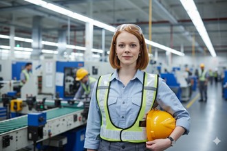 “Altere o fundo da imagem para uma fábrica, com pessoas trabalhando ao fundo. Aproxime a personagem da câmera e a vista com uma roupa de engenheira de produção”.