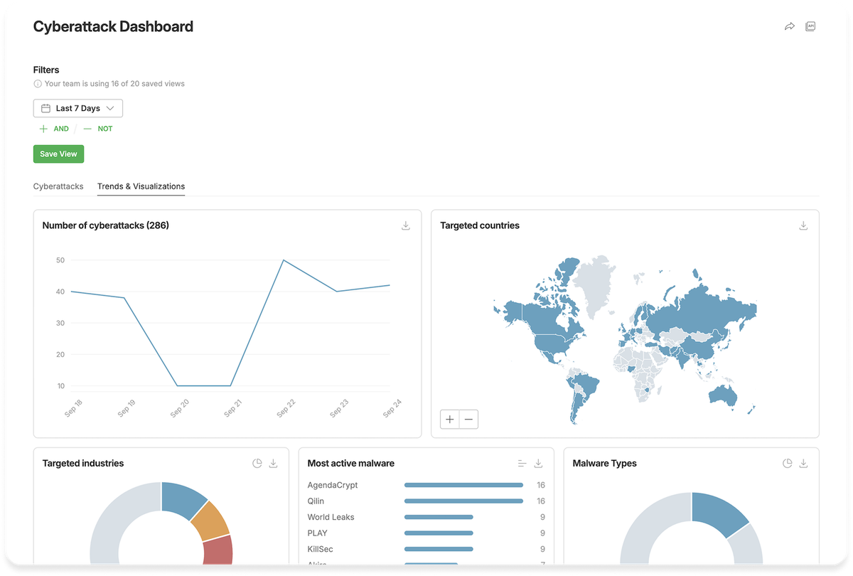 Filter cyberattack intel to identify attack chains, victims, attributions, and more with Feedly’s Cyberattack Dashboard.