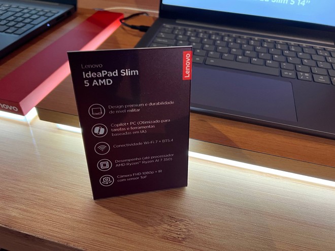 O IdeaPad Slim 5 chega como opção mais avançada, trazendo acabamento em alumínio e tela de 14 polegadas WUXGA (1920×1200), IPS, 300 nits e suporte a até 400 nits com taxa de atualização de 120 Hz. O modelo é equipado com os novos processadores AMD Ryzen AI série 300, com NPU dedicada para recursos de inteligência artificial de até 50 TOPs.