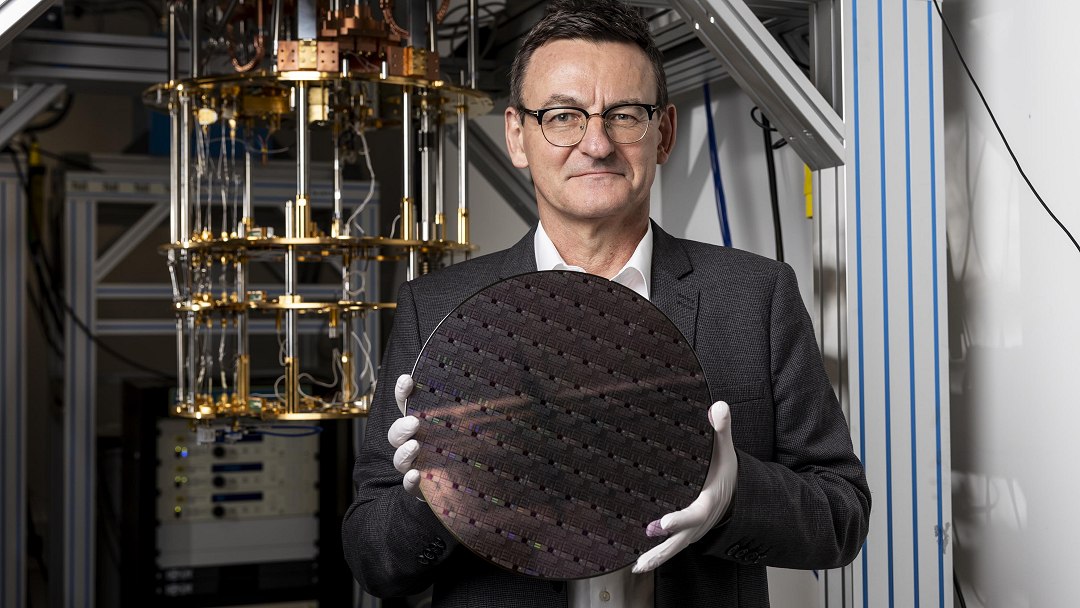 O professor Andrew Dzurak segurando a pastilha de silcio de 300 mm contendo os processadores qunticos desenvolvidos por sua equipe, e a agora fabricados industrialmente pela primeira vez.