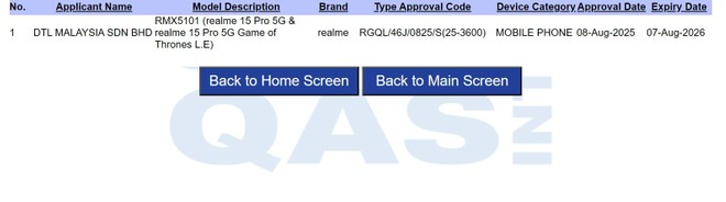 Como pode ser visto na imagem abaixo, a SIRIM homologou o modelo Realme 15 Pro Game of Thrones Edition. Isso indica que ele será anunciado em breve na Malásia, mas é provável ser certificado por autoridades reguladoras de outros países nos próximos dias e seja disponibilizado em mais regiões.
