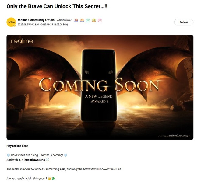 Em seu site oficial, a realme divulgou um teaser oficial de uma edição especial do realme 15 Pro baseada em Game of Thrones. Ela traz o slogan “Uma Nova Lenda Desperta”, mas não cita quando será lançada, apenas que ocorrerá em breve.